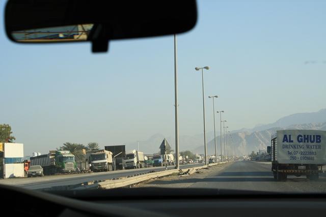 আমাদের ডেরা থেকে ওমান বর্ডার প্রায় ১৫০ কি/মি. - তাই একটু সকাল সকাল রওনা দিতে হবে। বাঙালির লেট লতিফ বদনাম ঘুচিয়ে দেয়ার চেষ্টাতেই মনে হয় সবাই আমরা ভোর ৬টায় যার যার গাড়ি নিয়ে রেডি হয়ে গেলাম। হালকা ঝিরি ঝিরি বৃষ্টির মধ্যে আমরা খালি হাইওয়েতে গাড়ি ছুটালাম ১৪০ কি.মি. এ - মাঝখানে নাস্তার জন্য একটা কাফেটেরিয়া (আসলে টঙ্গের দোকান, খালি পাকা দেয়াল বলে কাফেটেরিয়া নাম) থেকে কিমা পরোটা ডিমভাজি নিয়ে নিলাম। এই দুবাই বা মধ্যপ্রাচ্যে থাকার একটা সুবিধা হচ্ছে হালাল হারাম নিয়ে চিন্তা করতে হয় না আর দেশী খাবার দাবার মোটামুটি সহজলভ্য ভারতীয়দের কল্যাণে। যা হোক সে নিয়ে আরেক দিন বক বক করা যাবে।