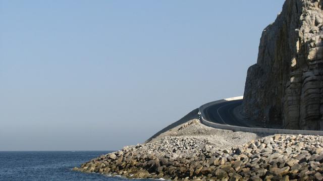 কুচ পরোয়া নেই, টুরিস্টদের জন্য এরা সব ব্যবস্থাই করে রেখেছে। বর্ডার ইমিগ্রেশন অফিসারই দেখিয়ে দিলেন ওমান ইন্সুরান্সের বুথ। ৩০ দিরহামের বদলে দশ মিনিটেই এক মাসের ইন্সুরেন্স হয়ে গেল (যদিও দরকার ছিল এক দিনের - কিন্তু সর্বনিম্ন এক মাসেরটাই পাওয়া যায়)। ধীরে ধীরে বর্ডার চেকপোস্ট পাড়ি দিয়ে আমরা ঢুকে পড়লাম মুসান্দাম উপদ্বীপে - আর আল্লাহর ইচ্ছায় তখন মেঘ কেটে গিয়ে আলো ঝলমলে হয়ে উঠলো চারিদিক। একটা ছোট পাহাড় পেরুতেই উদ্ভাসিত হয়ে উঠলো এক অসাধারণ দৃশ্য - এক পাশে পারস্য উপসাগর ঢেউ ভেঙ্গে পড়ছে, আরেক পাশে চুনাপাথরের আঁকাবাঁকা পাহাড়, মাঝখানে মসৃন পিচঢালা মহাসড়ক। মাঝে মাঝে পথ উঠে গেছে পাহাড়ের মাথায়, আবার কখনো বাঁক খেয়ে নেমে গেছে উপত্যকার মাঝে।