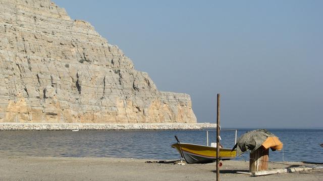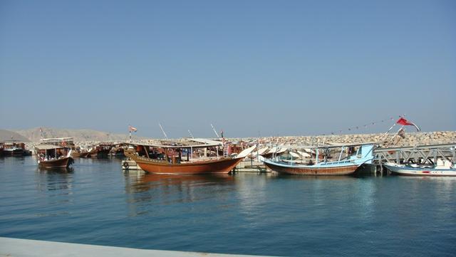 দশ মিনিট ড্রাইভের পরই আমরা পৌছে গেলাম খাসাব বন্দরে - ছোট মাছ ধরা বন্দর, বড় জাহাজ এখানে ভিড়ে না। কিন্তু ছোট ছোট ট্রলার বা আমাদের দেশী বজরা জাতীয় নৌকা যাকে বলে ধাউ অনেক আছে, এর চালকরাই মাঝি কাম গাইড কাম লাইফ গার্ড। কত টাকায় রফা হয়েছিল তা আর মনে নেই, তবে জলদিই আমরা নিজেদের একটা ধাউ এর গলুইয়ের উপর পেলাম। বসার চমত্কার ব্যবস্থা - মোটা কার্পেটের উপর নরম বালিশে বেশ আয়েশ করেই বসা যায়। এর সাথে তাজা ফল, জুস, চা, আর পানি রাখা আছে - যত খুশি নিয়ে নাও। দুপুরের খাবারও ওদের তরফ থেকে, পরে আরেকটা ধাউ এসে দিয়ে যাবে। বেশ খাসা ব্যবস্থা - মনটা বেশ ফুরফুরে হয়ে উঠেছে। আমি যে সাঁতার পারি না আর একটু পরেই যে মাঝ সমুদ্রে যেতে হবে সেটার দিকে কোনো ভ্রুক্ষেপই নেই !