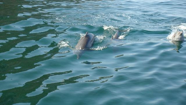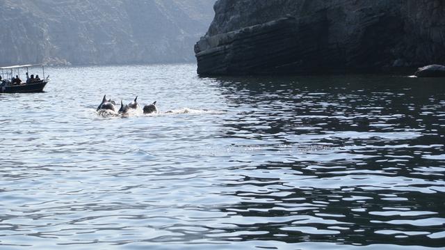 যাই হোক আমাদের ভ্রমন শুরু হলো - পারস্য উপসাগরের নীল পানি কেটে আমরা ছোট ছোট পাথুরে দ্বীপ পাশ কাটিয়ে এগোতে শুরু করলাম। এর মধ্যে শুরু হয়ে গেছে ফটোসেশন - কেউ টাইটানিক স্টাইলে, কেউ আবার জীবনসংগীর সাথে ফিল্মি স্টাইলে, আর আমরা যারা ব্যাচলর তারা বাঁদর স্টাইলে ইচ্ছে মত তুলতে থাকলাম। এর মধ্যেই এসে পড়ল যাদের দেখার জন্য এত দূর ছুটে আসা - ডলফিনের একটি ঝাঁক। আমাদের গাইড কাম মাঝি ভাঙ্গা হিন্দিতে যা বলল তার মানে এই দাড়ালো যে এই ডলফিনরা খাবারের লোভে জাহাজের আশে পাশে ঘুরে। ক্যামারাওয়ালারা তখন ঝাপিয়ে পড়েছে ডলফিনের ছবি নিতে। ডলফিনের দলটিও বেশ কায়দা কসরত করে ধাউ এর আশেপাশে ঘুরে বেড়াতে লাগলো, মানুষকে এরা আর ভয় পায় না এখন।